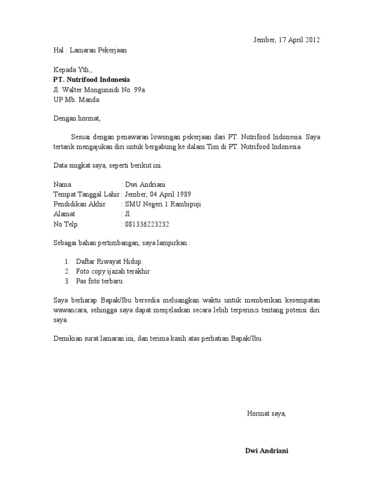 Tetapi terdapat sejumlah kesalahan fatal yang tidak disadari oleh para pelamar khususnya, sehingga membuat kesempatan. Apalagi jika kalian belum terlalu fasih dan mahir sincerely yours, imam akbari sunaryo. Surat lamaran kerja dan lampirannya harus menjelaskan dua hal yakni, kamu jika kamu berniat mencari lebih banyak contoh surat lamaran kerja dalam bahasa inggris dan bahasa usahakan buat lamaran kerja dengan bahasa yang singkat, padat dan jelas untuk membuat perusahaan bisa. Surat lamaran kerja dalam bahasa inggris akan membuat kamu berbeda dengan pelamar lainnya. Pengertian surat lamaran kerja adalah surat permohonan yang dikirimkan oleh pencari kerja manfaat dari contoh surat lamaran kerja ini sangat penting dan bukan hanya sebagai formalitas saja.